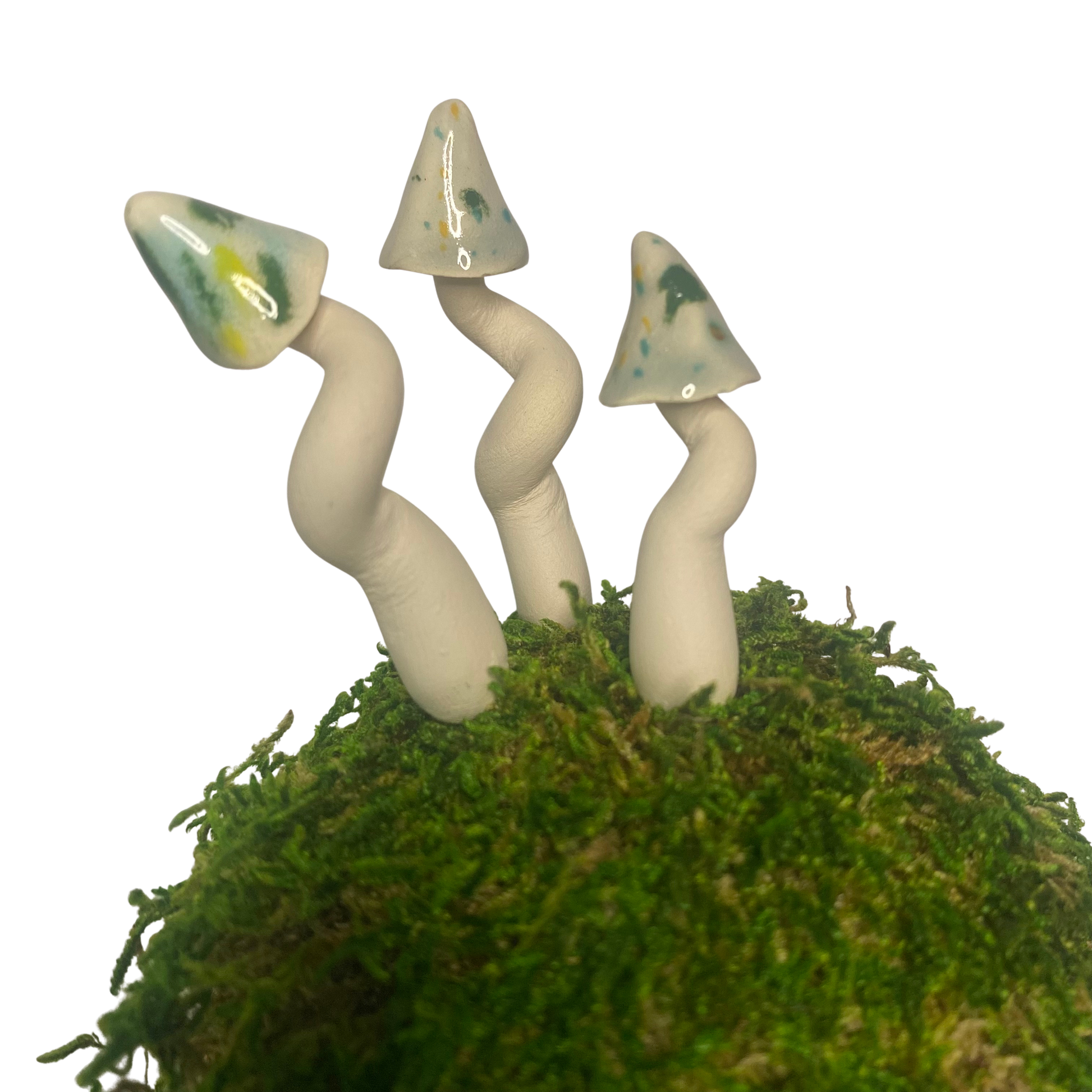 Each handcrafted cluster includes three unique mushrooms featuring our signature splatter glaze finishes—from dreamy sky blues and coral pinks to mossy greens and forest-inspired tones. Whether you’re curating a retail display, accessorizing houseplants, or crafting a whimsical scene, these colorful fungi will make your assortment truly eye-catching.